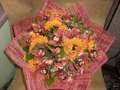 Состав букета: орхидея, хризантема кустовая, альстромерия, зелень