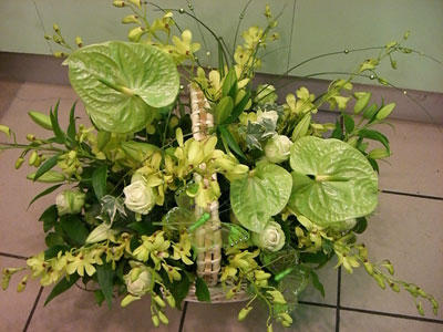 Состав букета: антуриум, роза, миниорхидея, лилия, зелень