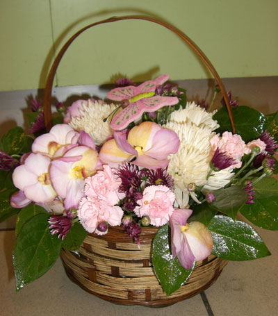 Состав букета: миниорхидея, гвоздика кустовая, хризантема кустовая, хризантема одноголовая, зелень