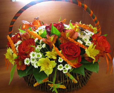 Состав букета: роза, сантини, альстромерия, колоски, зелень
