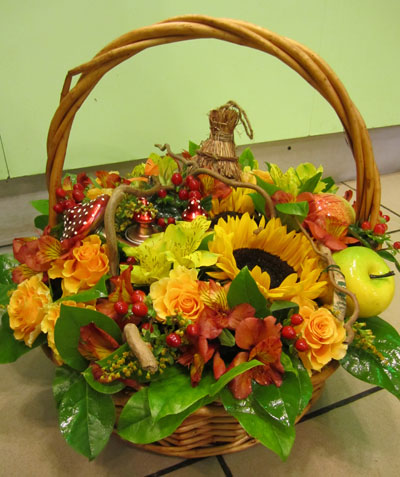 Состав букета: роза, гиперикум, альстромерия, салидага, подсолнухи, зелень