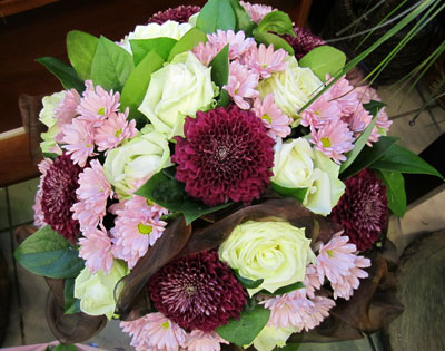 Состав букета: хризантема одноголовая, роза, хризантема кустовая, зелень